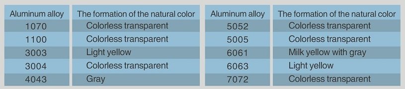 顏色:染料會因素材質不同,形成天然色澤的改變。染料本身會因鋁材合金不同,在氧化時所產生的天然色澤不同(如下表)。氧化本身也會因溫度、硫酸濃度、時間、電壓、鋁離子、濃度、毛細孔大小,也都會產生顏色不同的變化。